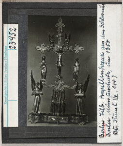 In diesem Fall zeigt der Fotodruck ein prachtvolles, Mitte des 14. Jahrhunderts gefertigtes Kreuz, das sich früher im Basler Münsterschatz befand, zur Zeit des Druckes jedoch bereits im Berliner Schlossmuseum. Seit dem Zweiten Weltkrieg ist das Kreuz verschollen und vermutlich zerstört.