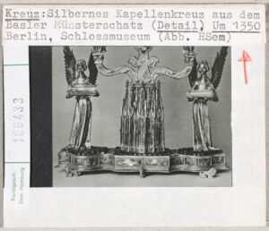 Dabei existierte bereits ein Großdia des Basler Kreuzes. Es trägt die Inventarnummer 23952 und entstand Anfang der 1950er Jahre. Auch hier war der Fotodruck des Angelsachsenverlages Vorlage. Die Quellenangabe informiert „Dt. Kunst IV 114“, die Nummer des Fotodruckes. Vielleicht aufgrund der damals nicht sonderlich guten Fotoausrüstung (der Fotograf beschwerte sich einmal, dass er Teile auf dem Schwarzmarkt hatte besorgen müssen) ist das alte Dia aber recht dunkel geraten. Dies war wohl der Grund, dass 20 Jahre später ein weiteres Exemplar und ein Detail angefertigt werden mussten.
