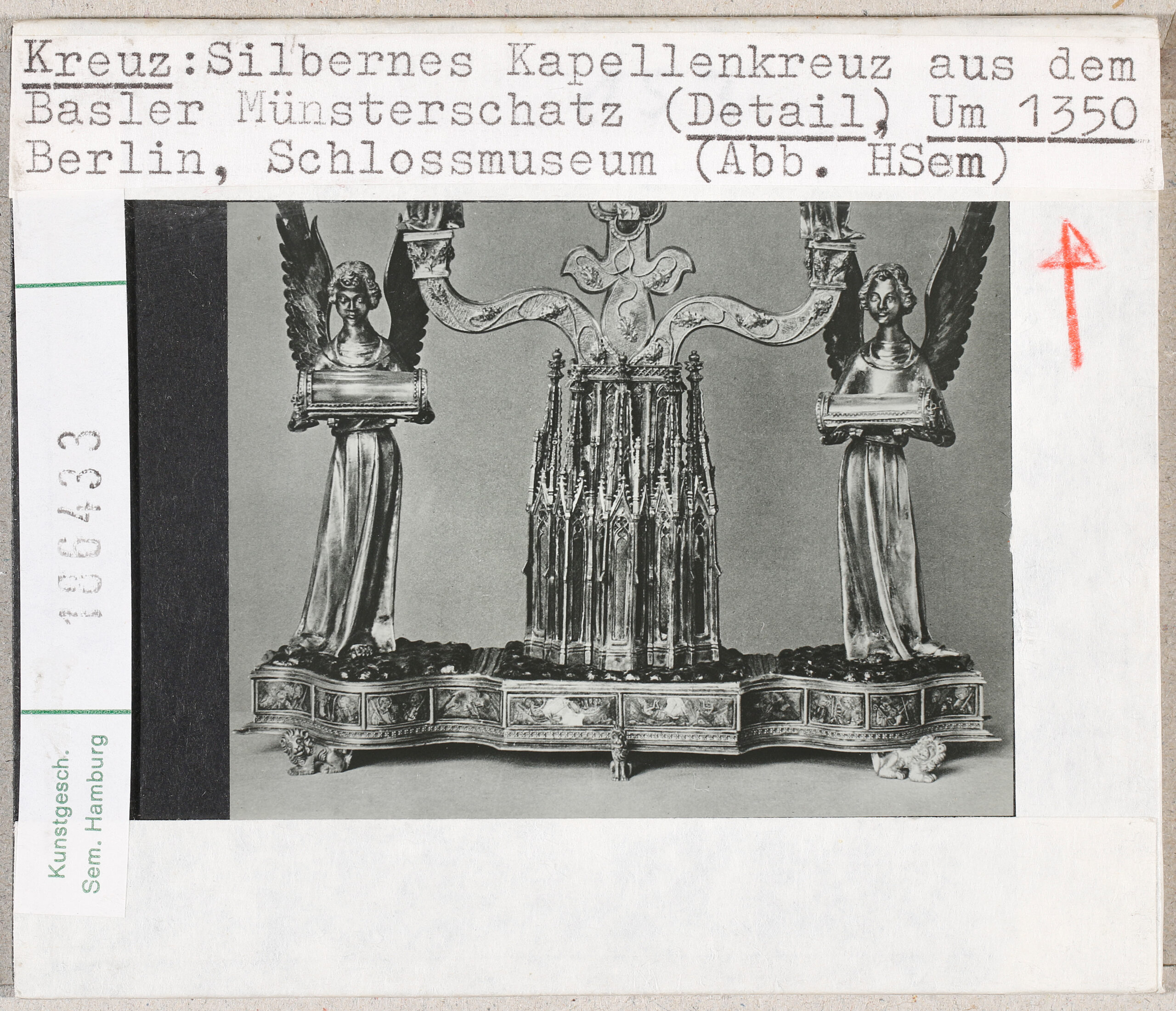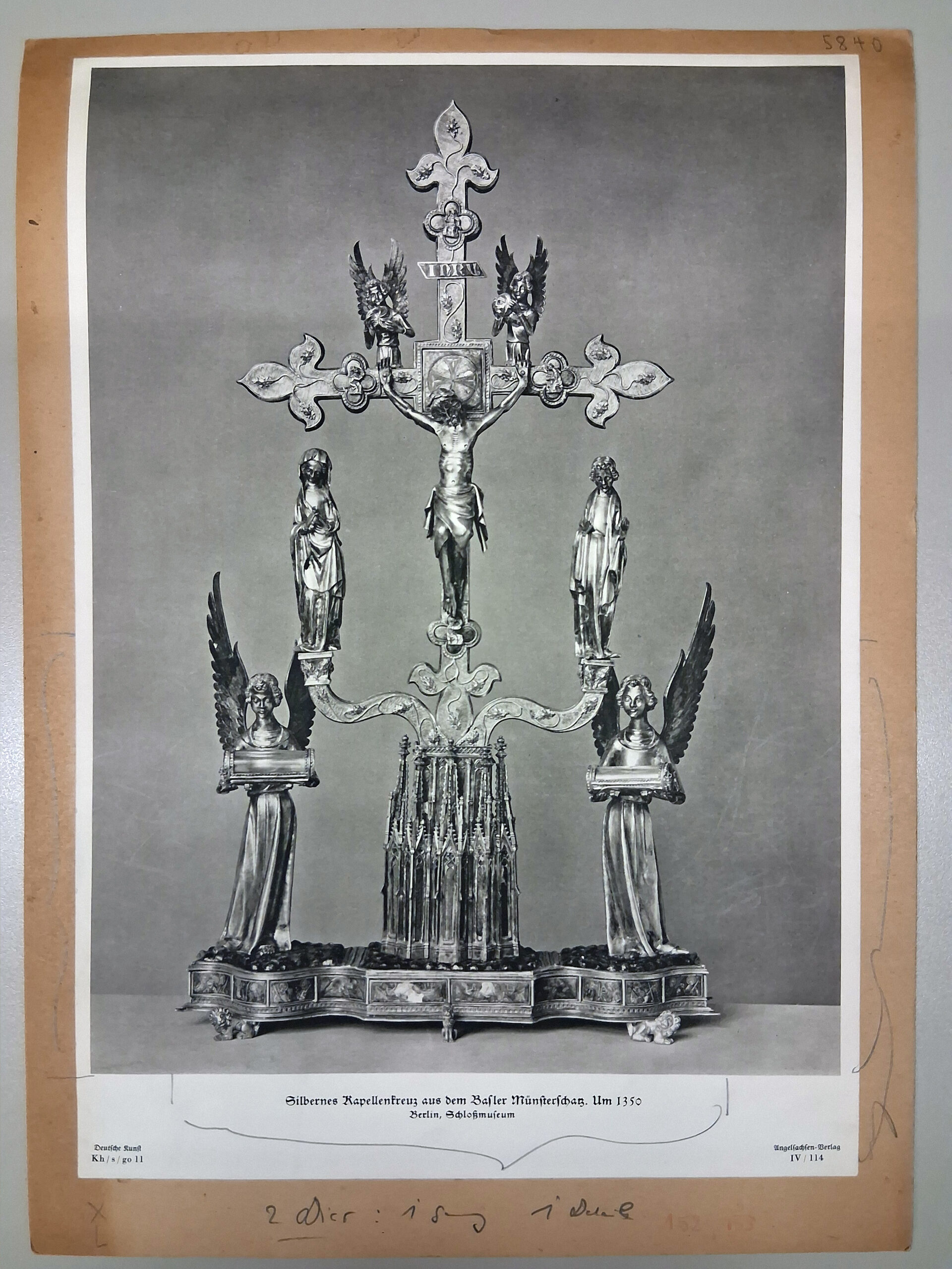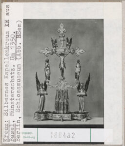 In diesem Fall zeigt der Fotodruck ein prachtvolles, Mitte des 14. Jahrhunderts gefertigtes Kreuz, das sich früher im Basler Münsterschatz befand, zur Zeit des Druckes jedoch bereits im Berliner Schlossmuseum. Seit dem Zweiten Weltkrieg ist das Kreuz verschollen und vermutlich zerstört.