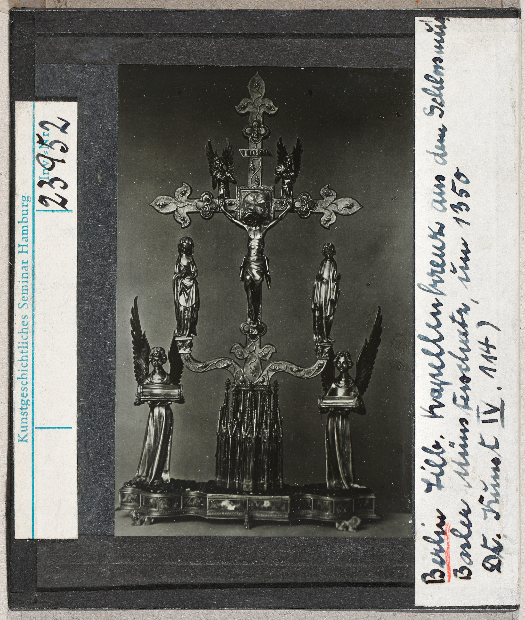 Dabei existierte bereits ein Großdia des Basler Kreuzes. Es trägt die Inventarnummer 23952 und entstand Anfang der 1950er Jahre. Auch hier war der Fotodruck des Angelsachsenverlages Vorlage. Die Quellenangabe informiert „Dt. Kunst IV 114“, die Nummer des Fotodruckes. Vielleicht aufgrund der damals nicht sonderlich guten Fotoausrüstung (der Fotograf beschwerte sich einmal, dass er Teile auf dem Schwarzmarkt hatte besorgen müssen) ist das alte Dia aber recht dunkel geraten. Dies war wohl der Grund, dass 20 Jahre später ein weiteres Exemplar und ein Detail angefertigt werden mussten.