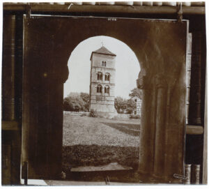 Fotografiert wurden sie wohl mit einer Rollfilmkamera im ersten Viertel des 20.Jahrhunderts. Was diese Fotoserie so besonders macht, ist die Möglichkeit, das Vorgehen bei der Repro-Anfertigung zu sehen. Hier wurde kein Negativfilm oder eine Negativplatte „fachmännisch“ vervielfältigt, sondern ein Positivabzug. Dieser ist behelfsmäßig mit Klammern und Klemmen vor einem Bücherregal aufgehangen. Daraus kann eine ungefähre Seitenlänge von 30 cm des Originalabzuges geschlossen werden. Oben auf dem Abzug ist – seitenverkehrt – die Negativnummer und eine nicht zu identifizierende Beschriftung zu erkennen. Es handelt sich um Fotografien von Albrecht Meydenbauer, die um 1900 mit einer Meßbildkamera fotografiert worden waren.
