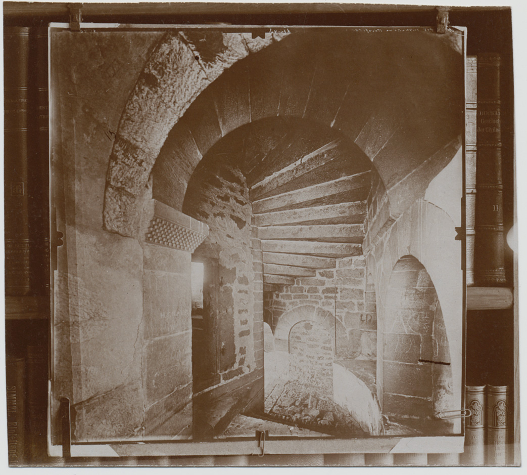 Fotografiert wurden sie wohl mit einer Rollfilmkamera im ersten Viertel des 20.Jahrhunderts. Was diese Fotoserie so besonders macht, ist die Möglichkeit, das Vorgehen bei der Repro-Anfertigung zu sehen. Hier wurde kein Negativfilm oder eine Negativplatte „fachmännisch“ vervielfältigt, sondern ein Positivabzug. Dieser ist behelfsmäßig mit Klammern und Klemmen vor einem Bücherregal aufgehangen. Daraus kann eine ungefähre Seitenlänge von 30 cm des Originalabzuges geschlossen werden. Oben auf dem Abzug ist – seitenverkehrt – die Negativnummer und eine nicht zu identifizierende Beschriftung zu erkennen. Es handelt sich um Fotografien von Albrecht Meydenbauer, die um 1900 mit einer Meßbildkamera fotografiert worden waren.